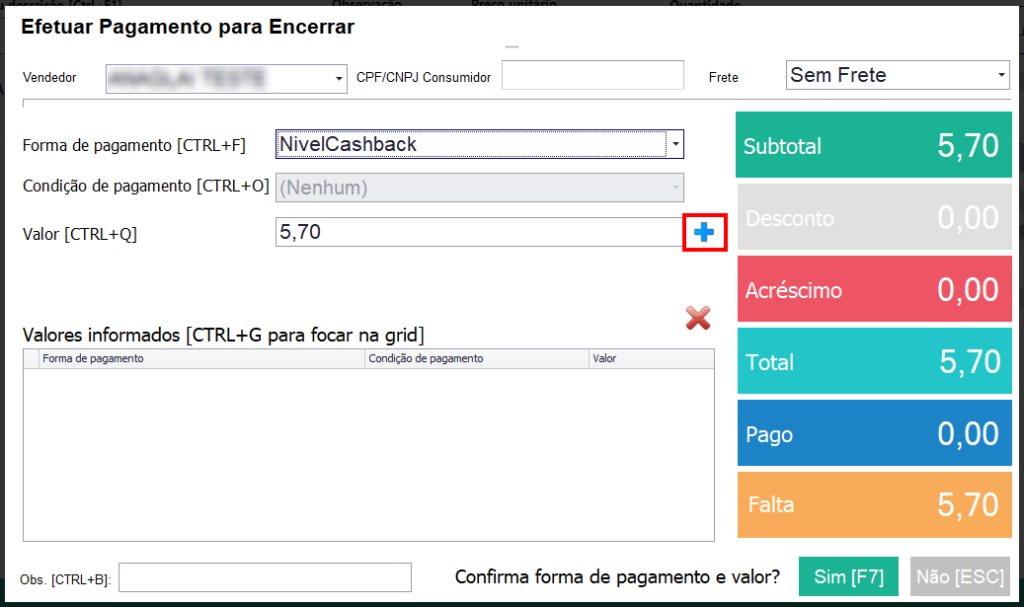 Passo 8. Clique F7 para finalizar a venda, escolha como forma de pagamento Nivel Cashback e clique em adicionar ou clique Enter para adicionar a forma de pagamento a esta venda.