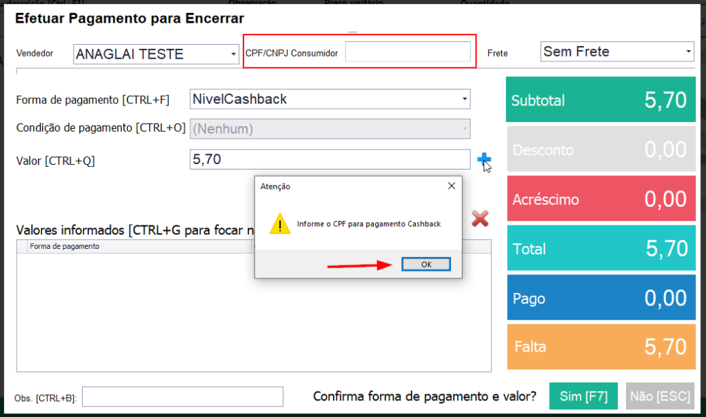 Passo 9. Após adicionar a forma de pagamento a esta venda, o sistema irá exigir que o consumidor final forneça o CPF para o pagamento cashback. Digite o CPF neste campo mostrado abaixo.