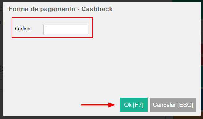 Passo 10. Após o sistema reconhecer o CPF do cliente será necessário que o cliente tenha em mãos o código fornecido no Nível Cashback. Após colocar o código finalize a venda normalmente.