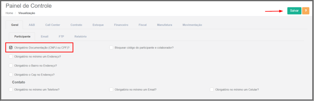 Para o sistema obrigar no cadastro do participante as documentações como CPF ou CNPJ é necessário que você habilite a opção Obrigatório Documentação(CNPJ ou CPF)?
