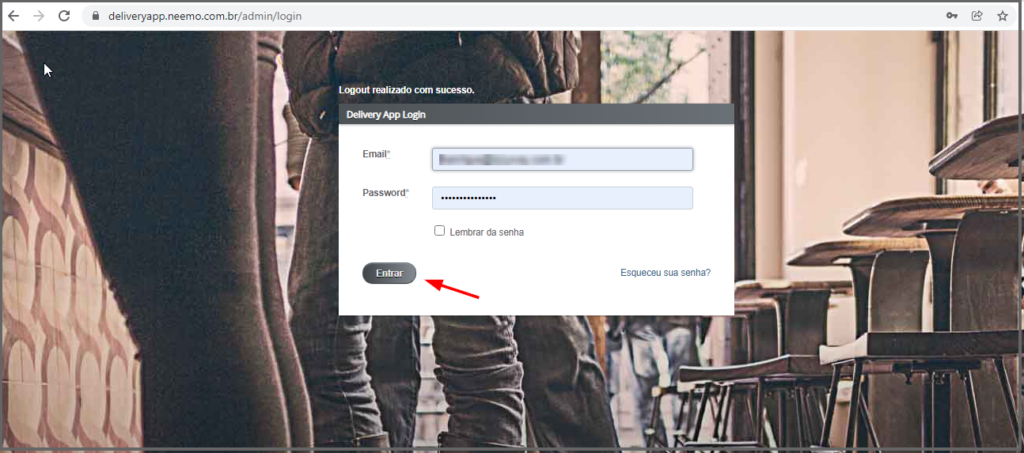 Passo 1. Primeiramente acesse o https://deliveryapp.neemo.com.br/admin/login coloque o Email e Password e clique em Entrar.